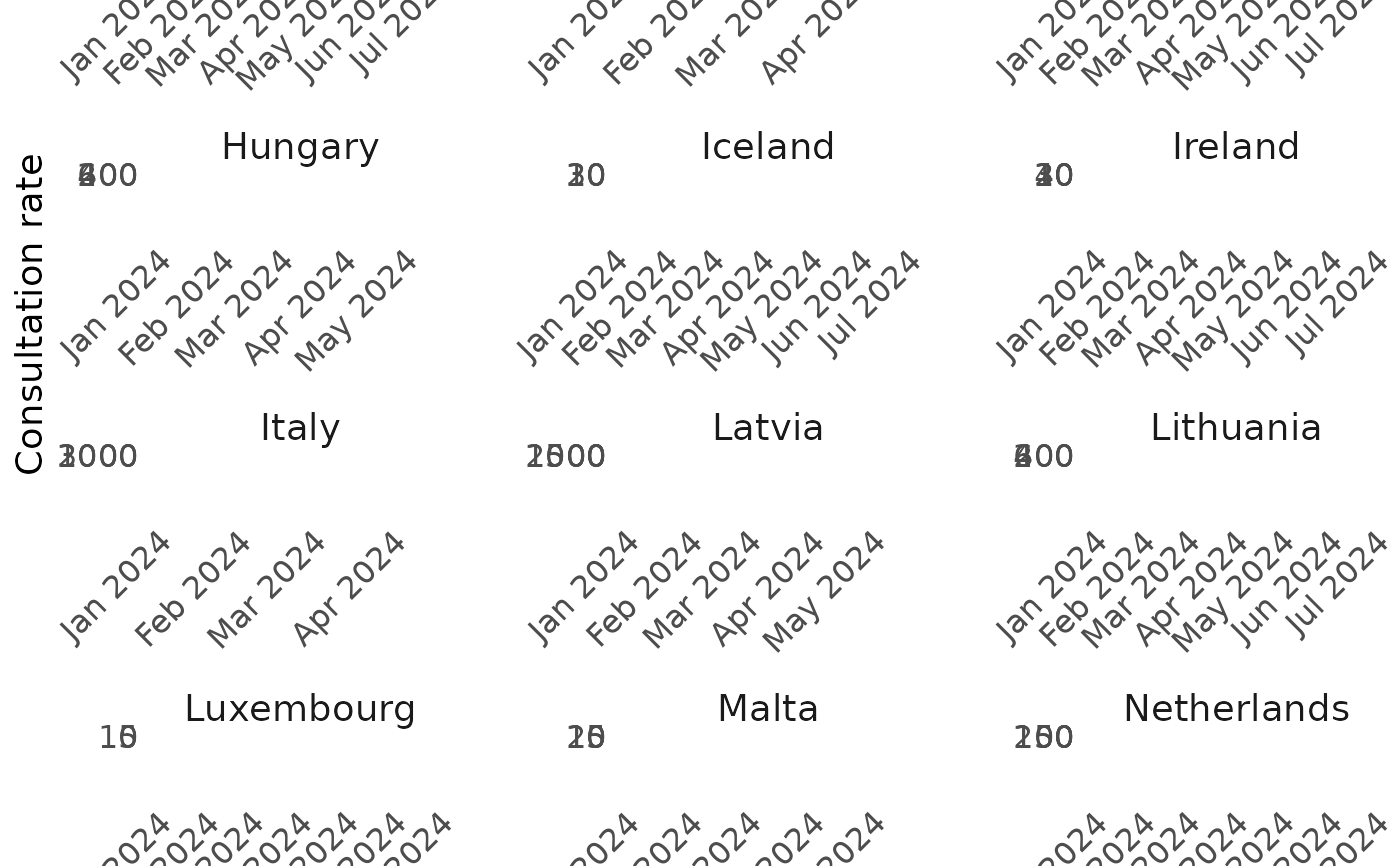 Creates a ggplot2 visualization of ILI/ARI consultation rates, with facets by country and colored by age group.